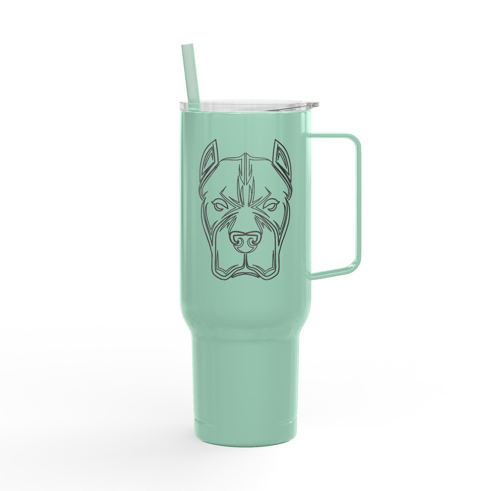 This 40oz insulated tumbler brings calm focus to long days with a bold engraved dog portrait and clean glossy finish. Built for people who move—road trips, long training sessions, or backyard hangs—its double-wall vacuum keeps coffee hot and iced drinks cold for hours while the large comfort handle and tapered base make it easy to carry and fit in cup holders. The press-fit slider lid and matching straw let you sip on the go without splashes, and the engraved print matures with use instead of peeling. Hand wash to keep the finish bright. Thoughtful materials—90% recycled 304 stainless steel and a 100% recycled plastic lid—make it a quieter, more durable choice for daily routines.